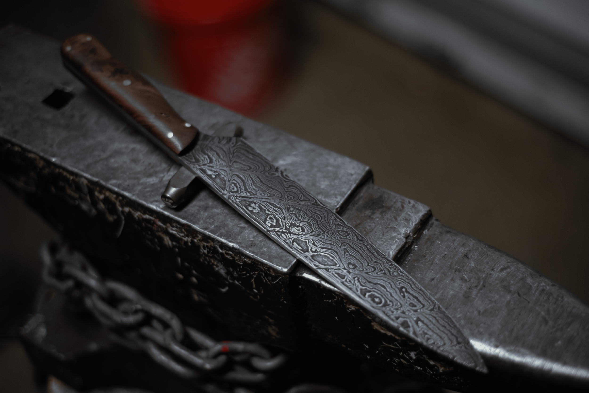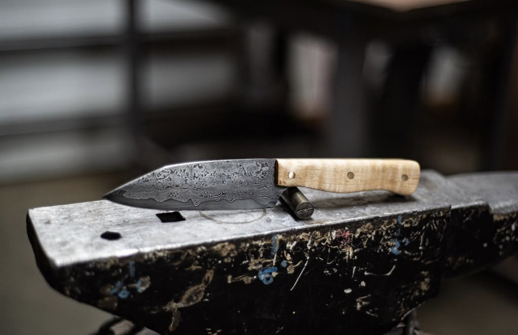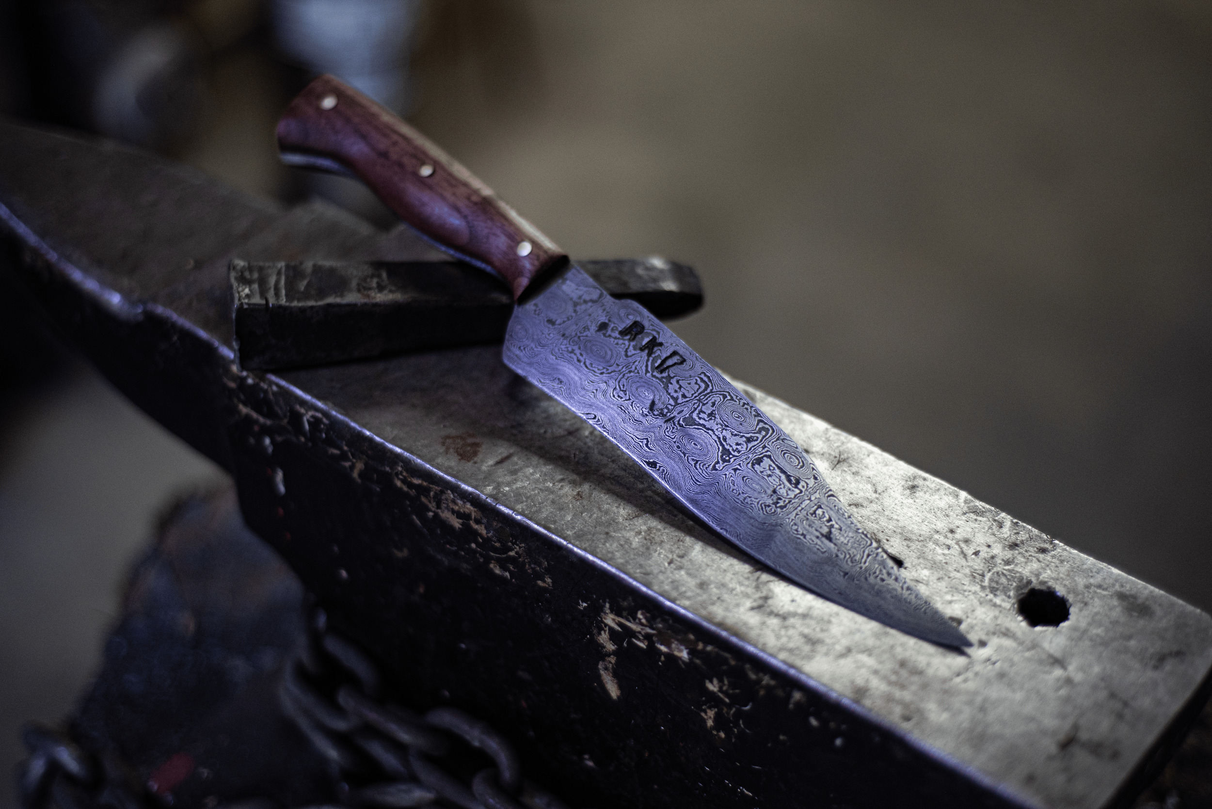 A Damascus steel chef's knife with a wooden handle resting on an anvil in a blacksmith's workshop.