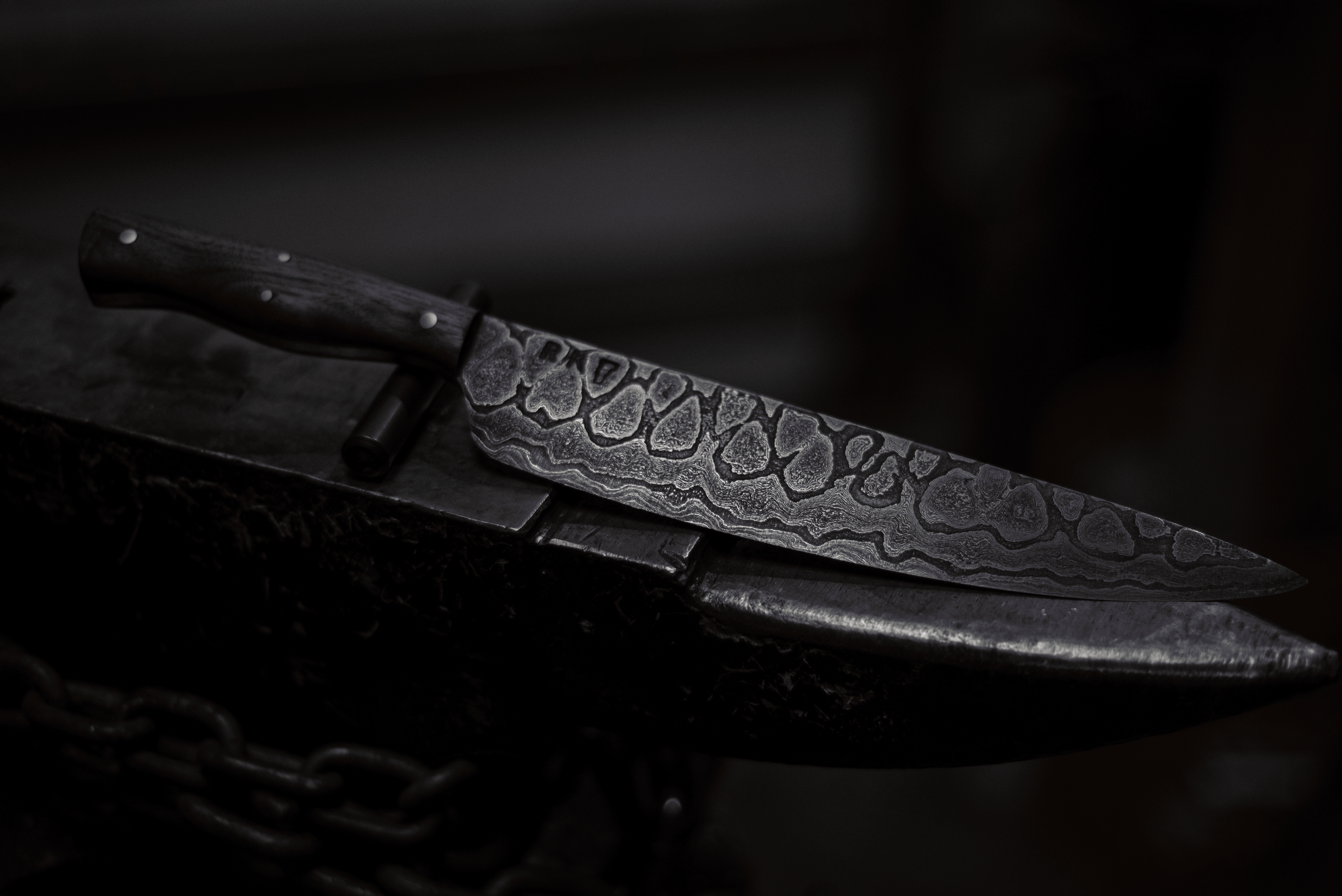 A close-up of a Damascus steel kitchen knife with a textured blade, resting on a dark surface with a chain nearby.