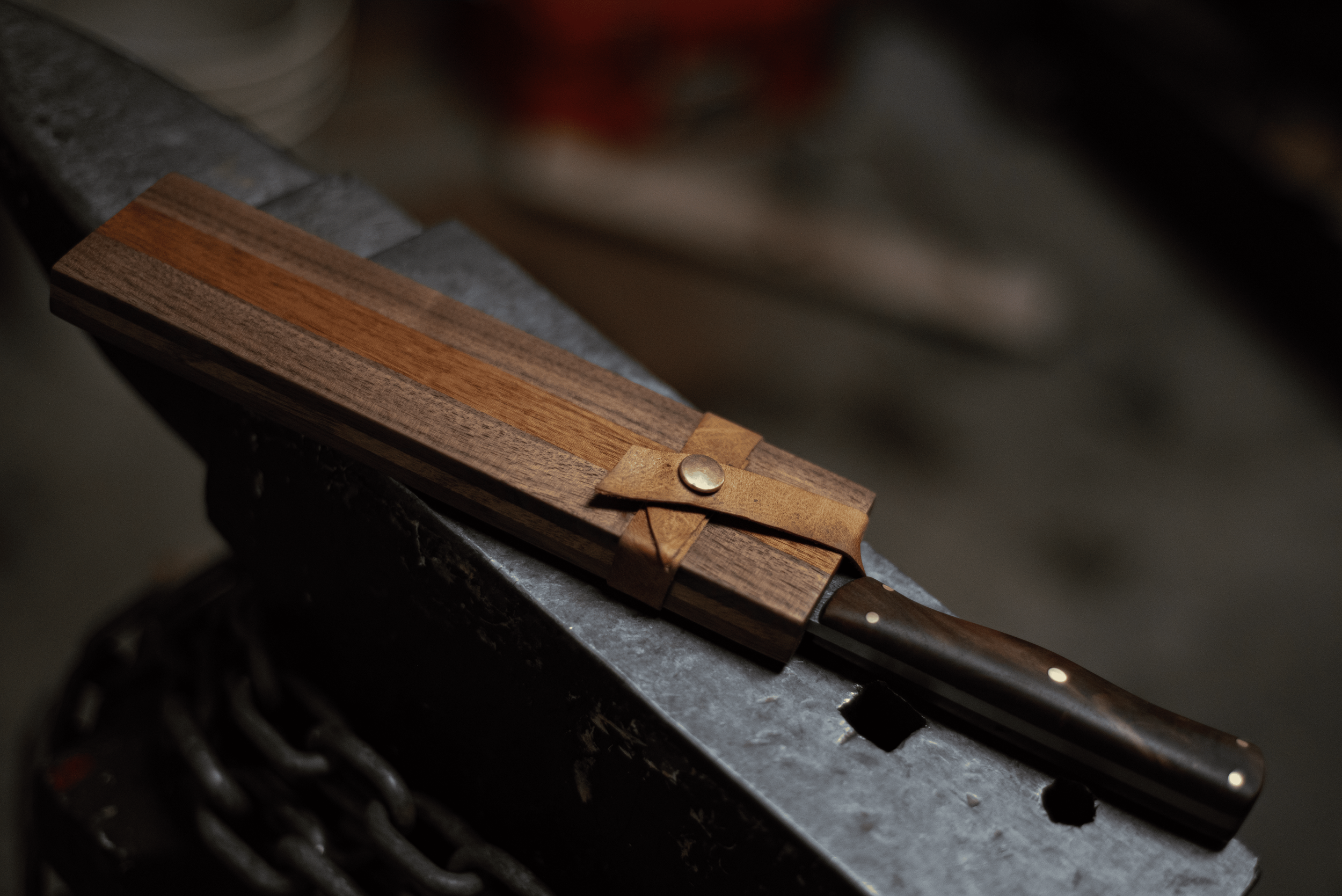 A metal knife with a wooden handle resting on a black metal surface, with a metal hook or clamp attached to the handle, and a chain beneath the surface.